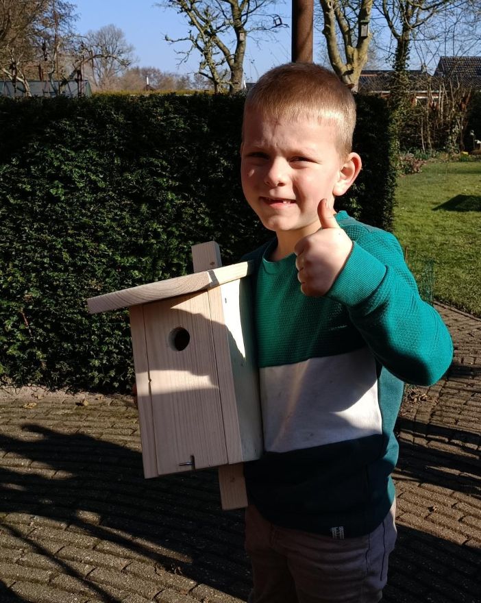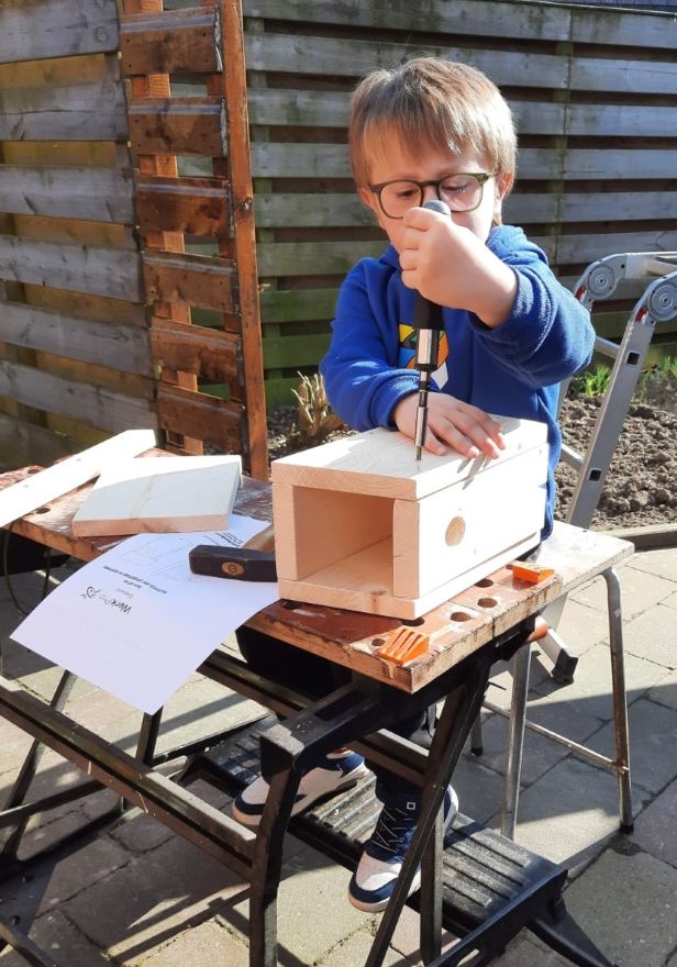 Josse (5 jr) en Thijs (9 jr) gingen samen met hun oma en opa eerst een rondje door de tuin van secretaris Hilde van Heuveln lopen. Ze kregen uitleg over de verschillende huisjes die daar hangen; een mussenflat, zwaluwnestjes, mezenkasten en een grote uilenkast. Daarna mochten ze zelf aan de slag met bouwpakketjes. Er werd fanatiek gehamerd en zelfs een accuboormachine werd door de kinderen ter hand genomen, geholpen door Oscar de Jong. Met een flyer met tips waar en hoe je het vogelhuisje kan ophangen gingen de jongens trots met hun nestkast onder de arm huiswaarts.