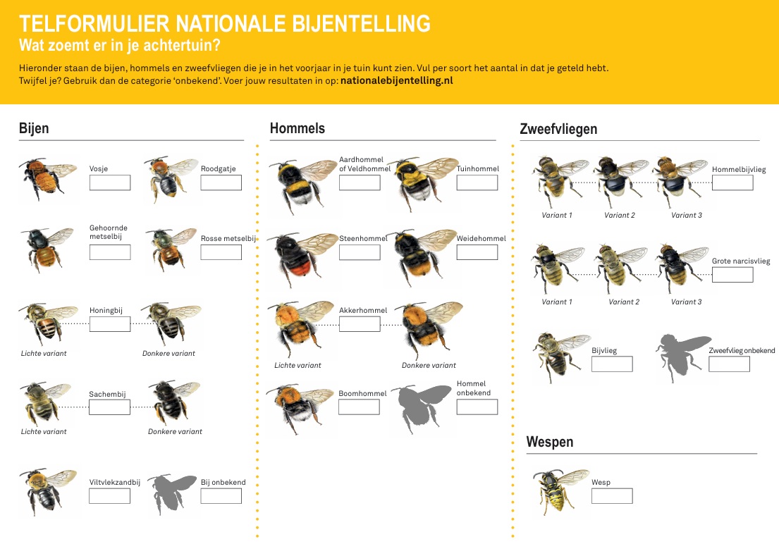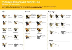 En het geeft niet als je niet alle bijen, hommels en zweefvliegen kunt onderscheiden. Op het telformulier zijn daar de hokjes ‘bij onbekend’, ‘hommels onbekend’ en ‘zweefvlieg onbekend’ voor. De onderzoekers zijn al heel blij als je het aantal doorgeeft.