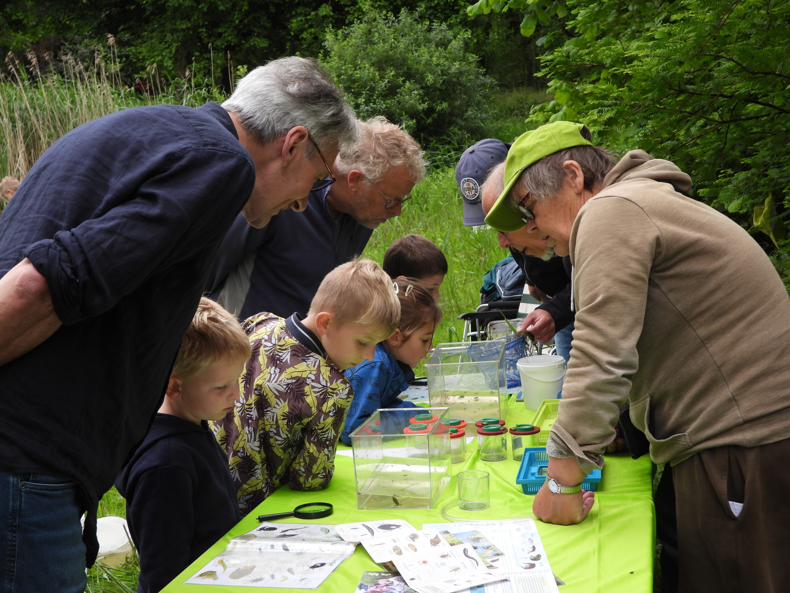 Hilde vertelde allereerst over de functie van een insectenhotel, waarna een paar orchidëen werden bekeken. Johanna liet de kinderen vervolgens op zoek gaan naar gele bloemen; er werden 3 plantensoorten gevonden. Vervolgens konden de kinderen met een schepnetje gaan vissen. Opvallend veel kikkervisjes en bootsmannetjes dit keer. In totaal werden 14 verschillende soorten gevonden. Wie uitgevist was kon een bootje van riet maken en deze laten varen.