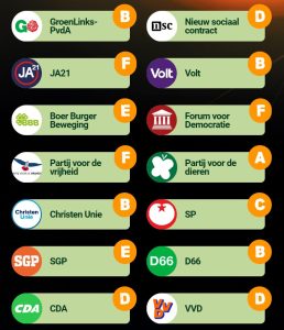 De website www.stemvoordenatuur.nl heeft onderzocht welke politieke partijen zich het beste inzetten voor de natuur en het klimaat. Uit de partijprogramma’s van de viertien grootste partijen werden zoveel mogelijk concrete actiepunten verzameld die te maken hebben met natuur, milieu en klimaat. Dat gaat dus over onderwerpen als energie, mobiliteit, voeding, landbouw, natuur, wonen en leefomgeving.