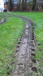 De op de weg gewaaide takken worden opnieuw opgestapeld en er wordt 1 kar met takken verwerkt. Maar het waait te hard om verder te gaan. Ook is het land eigenlijk te nat om daar met trekker en kar op te rijden (zie foto).