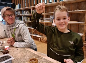 Bij de knutseltafel konden kinderen bij ons kleuren, van klei en esdoornzaadjes beestjes maken en ze konden met een denappel, vogelpindakaas en vogelzaad hun eigen vogelvetbollen maken.