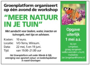 Het Groenplatform in Het Hogeland geeft in mei en juni op één avond een workshop over natuurlijker tuinieren.