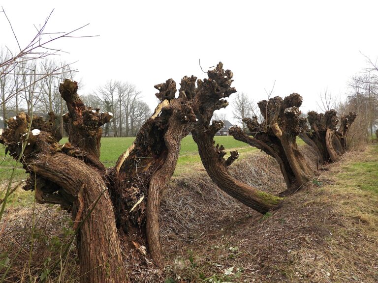 Op het perceel staan een aantal heel oude wilgen, mogelijk wel 125 jaar oud, en een aantal jongere exemplaren. Deze zaterdag zijn met name de heel oude bomen aangepakt, die soms meerdere knotten per boom hadden; een heel werk dus. Omdat het de laatste tijd droog was geweest, was het land en de greppel droog wat het verzamelen en slepen van de takken een stuk vergemakkelijkte.