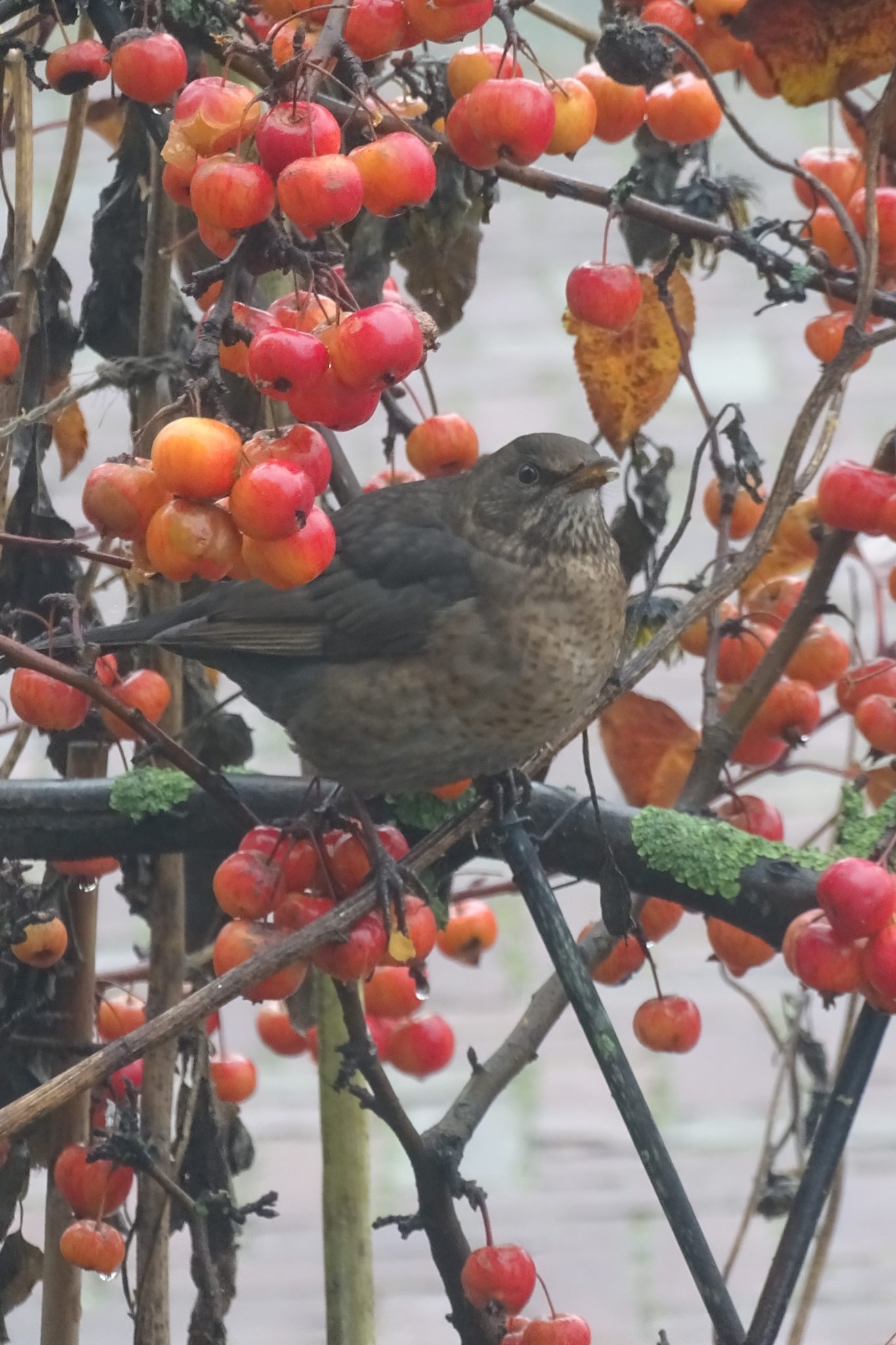 Even later stonden we in de tuin bij de merel, die op de kleine sierappeltjes van de aldaar aanwezige struik (Malus speciales) was afgekomen. Ze, want het was een vrouwtje, vond het blijkbaar makkelijker om in op de grond liggende appeltjes te pikken, want dat scheelde weer wat sloopwerk aan appeltjes aan de struik. Maar door die voorkeur raakte ze al meer in het dicht bij de grond liggende net verstrikt. Ze lag er voor dood bij. Ik pakte het beestje vast en tilde haar op, met net en al. “Nou, nou, die zit helemaal verstrengeld. Dat gaat niet lukken zonder het net stuk te knippen.” Voordat ik de zin had afgemaakt, was Marcel al naar binnen om een schaar te halen.