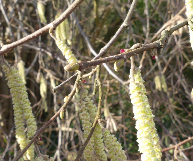 Daar staat “mijn” hazelaar, helemaal knalgeel en vol te bloeien. De mannelijke katjes hangen er al een maandje, maar de afgelopen weken zocht ik tevergeefs naar de vrouwelijke bloemetjes. Heb ik ze gemist? Ze zijn immers maar heel klein. Alle aandacht naar de mannen! Onterecht want als je het kleine rode speldenprikje bekijkt met een loep gaat er een wereld voor je open. Ze verschijnen wat later, vlak voordat de gele katjes hun stuifmeel loslaten. Hoe mooi is dat op elkaar afgestemd.