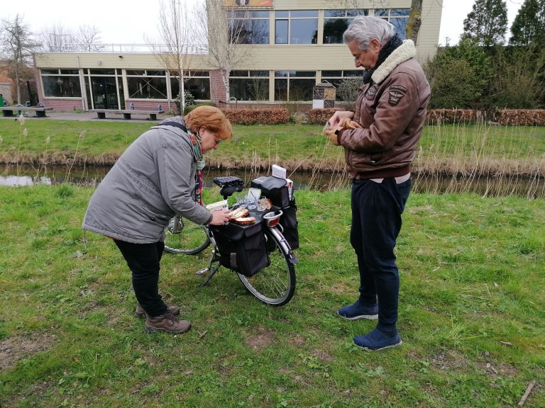 En dan, na het voorlaatste punt, zegt Emerens: “hier koffie, of straks?” We tellen nog even door tot en met het laatste punt, je moet immers eerst de koffie verdiend hebben? En dan tovert ze kopjes, thermoskan, mes, boter en heerlijk paasbrood uit haar fietstas. Niet te geloven wat er allemaal uit zo’n tas tevoorschijn kan komen.