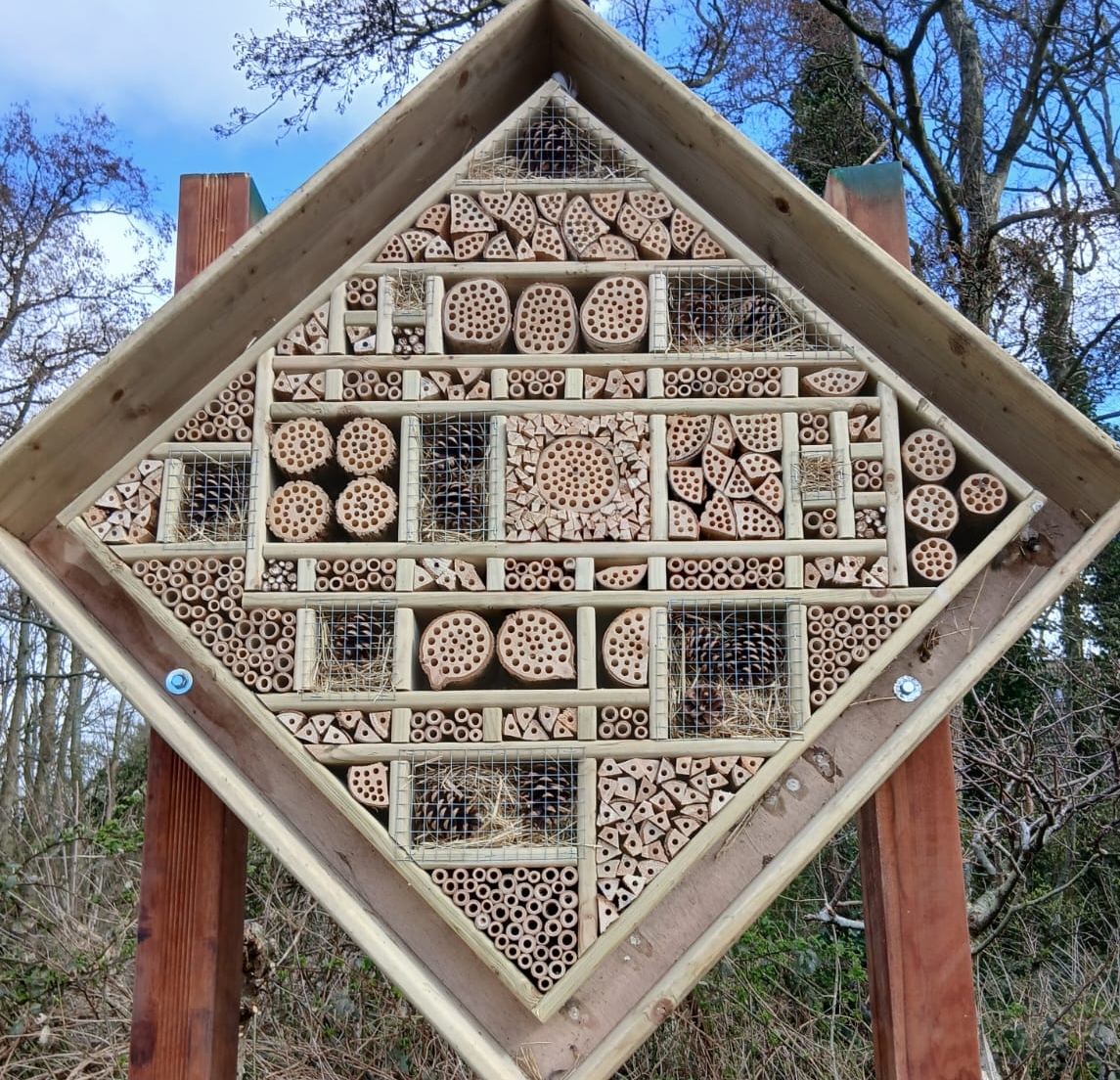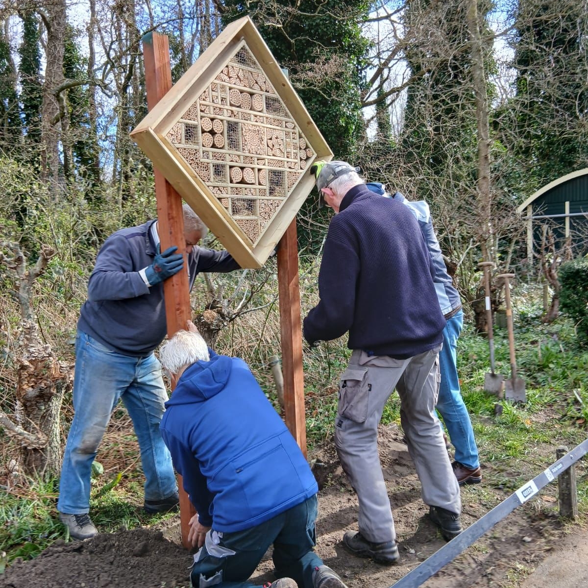Gedragen door vier vrijwilligers van de Kruidentuin Rekerhout, kreeg op zaterdag 29 maart een groot insectenhotel zijn bestemming. Stoer en onverwoestbaar staat het nu in de tuin; laat de gasten nu maar komen!