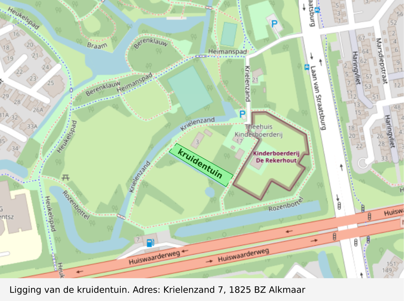 De kruidentuin ligt (dichtbij het theehuis en de kinderboerderij) in het park Rekerhout in Alkmaar Noord. Er is een parkeerterrein aan het begin van Krielenzand en beperkte parkeerruimte aan het eind bij de Kinderboerderij.