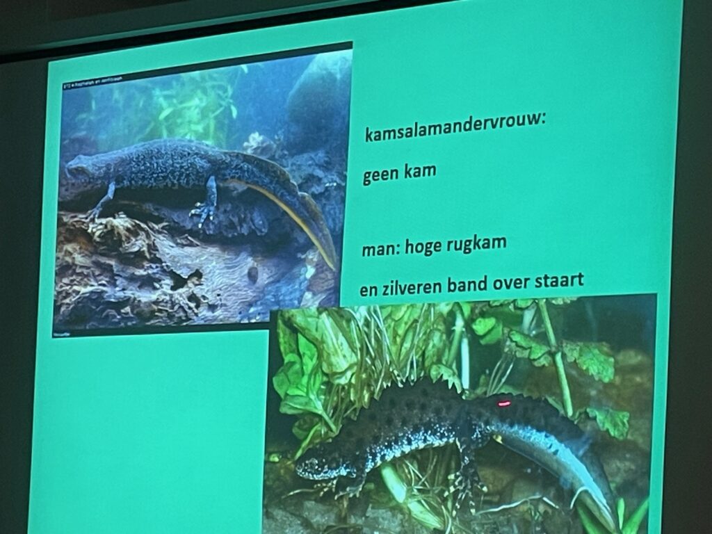 Wat is het verschil tussen een salamander en een hagedis? Een hagedis is een reptiel met een geschubde huid en op het land een snel dier. Een salamander heeft een naakte huid en is op het land langzaam ( maar snel in het water). Salamanders worden onderverdeeld in staartlozen en dieren met een staart. Kleine watersalamander en kamsalamander zijn de twee ondersoorten. Ze zijn niet groot, zo’n 5-7 centimeter. De kamsalamander is gemakkelijk te herkennen doordat hij een gele buik heeft met zwarte strepen. Ze leggen zo’n 100-200 eitjes, heel zorgvuldig op elk blad één eitje. Michel geeft ons een beschrijving van een ideale tuinvijver: vooral van belang is variatie in diepte en de vijver omgeven met struiken of bomen.