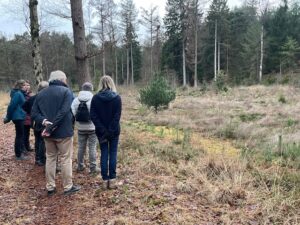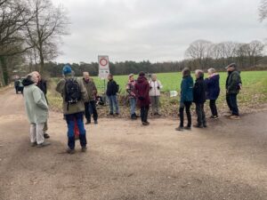Het is bewolkt, de temperatuur hooguit vijf graden en er is een vrij krachtig, snijdend koud windje. Maar de stemming is opperbest. Onze gidsen zijn deze middag: Rebecca Planteijdt, Homme Siebenga en Wybren Jouwsma. Hoofdgids Wybren vertelt als inleiding, dat hier 150 jaar geleden het hele gebied alleen uit heide bestond. Alle kerktorens in de omgeving waren vanaf hier te zien. Er woonden schapenboeren. Door zandverstuivingen ontstonden dekzandruggen. Door de opkomst van de kunstmest was het houden van schapen voor de mest niet meer rendabel. Er wordt begonnen met het aanplanten van bomen als productiebossen, hout voor de mijnbouw en timmerhout.