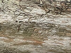 We zien een paddenstoel die eruitziet en aanvoelt als een spekzwoerd en dan ook een toepasselijke naam heeft: Spekzwoerdzwam. Homme noemt nog een voorbeeld van de vaak fraaie namen van padenstoelen: de Dakloze Huiszwam. Het hars van een Douglasspar blijkt heerlijk te ruiken. Het hars beschermt deze boom tegen schimmels. Omdat het een importboom is, trekt hij niet veel insecten aan, zoals wel rond een inheemse eik, die wel vierhonderd soorten insecten aantrekt. We bekijken een zilverspar en Homme laat een oude kaart zien waarop de bulten in het gebied duidelijk zichtbaar zijn. Iets verder liggen veel dode naaldbomen op de grond: een gevolg van de letterzetter, die gangen in de boom maakt (“letters”) en de sparren dood, een ware kaalslag.