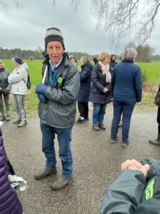 Zo’n vijfentwintig mensen hebben zich verzameld op deze zondagmiddag 11 februari 2024 bij de kruising Vordensebinnenweg/Galgengoorweg voorbij Vorden. De IVN vlag wappert in de wind. Wybren Jouwsma, een forse stevige Fries, is vandaag onze gids samen met drie andere gidsen. Van te voren heb ik Wybren de precieze locatie per mail gevraagd, want reeds twee keer liep ik een wandeling mis, doordat ik het startpunt niet kon vinden. En de naam Bronsbergen is mij veel bekender als locatie in Zutphen. Maar nu is alles goed gekomen. Er blijken meer Bronsbergen te bestaan, zoals deze bij Vorden.