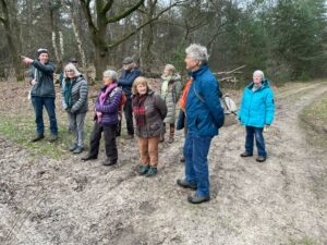We worden in vier groepen verdeeld en mijn vrouw en ik kiezen voor de groep van Wybren. We gaan met zo’n tien personen op pad. Onze gids blijkt hier al veertig jaar vlakbij te wonen en de streek op zijn duimpje te kennen. We gaan op pad en Wybren begint te vertellen over de historie van dit gebied. Hier loopt eigenlijk de oude weg van Lochem naar Vorden. Tot ongeveer 1850 was dit gebied volledig kaal en kon je de kerktorens van Lochem, Kranenborg, Almen en Vorden zien. Op advies van Koning Willem I werden er dennen geplant voor de houtproductie.