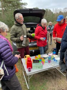 Bij een open vlakten zien wij wel veel “exotische aanplant”, allerlei bijzondere, hier normaal niet voorkomende bomen. We repeteren nog eens de naalden van de naaldbomen:een naald is solo, de spar, twee naalden, duo is de den en legio de larix. Een Wheymouth heeft vijf naalden. Deze laatste is veel aangeplant omdat hij mooi hout oplevert, door rechte stammen voor de houtindustrie. Bij een tonderzwam, aan een beuk, vertelt onze gids, dat deze vroeger gebruikt werden om vuur in de te bewaren.