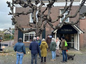 Inmiddels zijn we op pad gegaan, niet ver, want tegenover Museum Staal staat een grote Linde voor de ingang van de Hoofdige Boer. Hij wordt geschat op zeventig jaar maar is helaas gedoemd dood te gaan door een parasiet, die zich in hem heeft genesteld: de honingzwam.