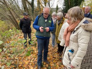 We staan stil bij een notenboom, buigen ons over de vraag hoe het een eekhoorn lukt om zo’n harde walnoot open te krijgen. Iets verderop staat in het parkbos een mooie kardinaalmuts, waarvan de roodroze vruchten inderdaad die vorm hebben, waardoor hij gemakkelijk herkenbaar zijn. Voor vogels een zeer geliefde vrucht. Inmiddels verschijnt zelfs de zon op het toneel en wordt het aangenaam in temperatuur. We lopen om de vijver van het Elger heen, waarin zeer veel essen in het water staan.
