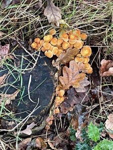 We bekijken een hazelaar en een moerascipres. Een koolmeesje hupt van tak naar tak. Rozenbottels zitten nog aan hun struiken. “Als een vlag”zo vertelt Homme,” beschermen bij een beuk”,de onderste takken de wortels tegen teveel zonlicht.” Van deze nuffige dame, zoals zij wordt genoemd, staan er ook hier velen. De rode koolzwam is de symbiont van de beuk. In deze samenwerking voeden zij elkaar De suiker van de boom gaat naar de zwam en voedingsstoffen van de zwam naar de boom.