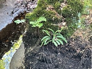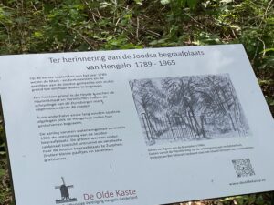 De pas wordt er flink ingezet, maar moet worden afgeremd omdat de tachtigjarige Sjef achter begint te raken. Hij heeft net een onderscheiding gekregen van de Koning voor zijn jarenlange inzet voor verschillende natuurverenigingen, waaronder het IVN. We blijven bij een eerste stop staan bij een vuilboom, waar Herman uitleg over geeft. Een wolwever vliegt voorbij en een witje fladdert om ons heen. Helaas is er net deze dag een jaarlijkse motorcross, waarvan het geluid ons de hele middag zal begeleiden, maar alles went , ook dit door er verder geen aandacht aan te schenken. Omdat dennenbomen zoveel water gebruiken, ze zijn het hele jaar bladgroen, door de wortels maar ook door de verdamping via de naalden, overweegt Vitens om de dennenbomen in het gebied te kappen. Door de verdroging begint het op peil houden van de watervoorraad precair te worden. We horen de mei-geluiden: fluitende vogels zoals de tjiftjaf,de roodborst, de mus en de zwartkop. Hoog in de lucht zien we zowaar een buizerd cirkelen op de thermiek. We komen aan bij een plaquette, die aangeeft dat hier van 1783-1965 een Joodse begraafplaats was voor Joodse mensen uit Hengelo. Herman tekent voor ons uit op de grond hoe de waterhuishouding hier het gebied wordt geregeld. Er worden reservoirs aangelegd vanuit de veenbeek naar ’t Klooster. Ook worden de beken minder diep gemaakt. Het is een samenwerking van het Waterschap, Vitens en de plaatselijke boeren. Iets verderop wijst Karen ons op een beuk, waarin een specht een hol heeft gemaakt en warempel, juist op dat moment vliegt er een zwarte specht uit en verdwijnt tussen de bomen. Bij een beek wijst Karen ons op een bijzonder soort varen: de dubbelsporen varen.
