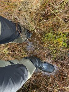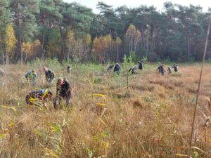 Een groep van totaal 27 enthousiaste mensen, waaronder 15 Junior Rangers van Nationaal Park Weerribben-Wieden, zijn na een korte werkinstructie het “moeras” ingegaan. Via 2 loopplanken over de ringsloot was het terrein toegankelijk gemaakt. Geen laarzen dragen betekende meteen natte voeten krijgen! Ook moest iedereen erg wennen aan het golvende en oneffen terrein, en je evenwicht bewaren ging niet iedereen even goed af. Onder leiding van de boswachters Jacco en Dirk kon daarna begonnen worden met de klus. Er werden allerlei struikjes uit de pingoruïne getrokken en gesnoeid. Boompjes, waaronder ook een paar forse grove dennen, werden omgezaagd.