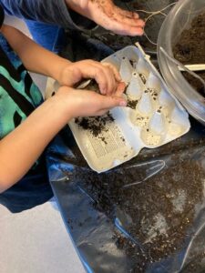 Na deze kennis gingen de kinderen zelf aan de slag. Iedereen maakte een eigen bijenhotel, een slaapplaats voor honingbijen. Met een hamer en priem, maakten de kinderen gaten in conservenblikjes Daarna vulden ze deze met klei en bamboestokken. Het zagen van deze stokken zorgde voor flink wat zweet, koste veel tijd, maar lukte uiteindelijk iedereen. Daarmee was het hotel klaar. Zonder voedsel komen er geen bijen naar het hotel. Tijd dus om ook te zorgen voor ontbijt, in de vorm van zaadbommetjes. Lekker met de handen een bol kneden bestaande uit zaad, klei en aarde. De meeste kinderen vonden dit een heerlijk werkje en allemaal gingen ze opvallend zorgvuldig met het zaad om. “ Mag ik er ook nog twee maken voor mijn broertje (of zusje)?†was een veel gehoorde vraag. Thuis kunnen de alle kinderen hun hotel en ontbijt in de tuin kwijt en ontdekken hoeveel bijen er komen. Verwondering in de tuin, daar draait het om.