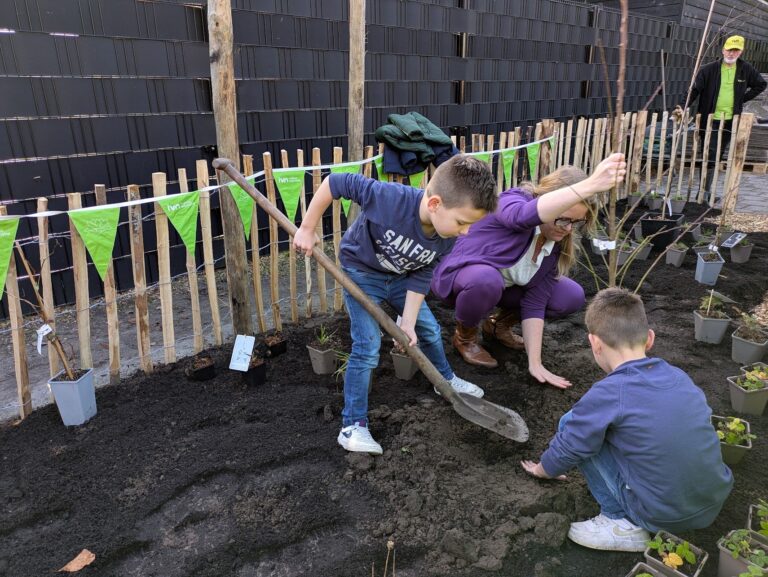 Na een korte uitleg mochten de kinderen zelf de jonge planten in de grond zetten: van appel- en perenbomen tot colakruid en citroenmelisse. De kinderen gingen er fanatiek mee aan de slag. Tussen het planten door waren kreten te horen als: ‘Juf, ik heb er al twee geplant!’, ‘Hé, een stekelplant!’ en ‘Is dat een braam? Lekker!’ De leerlingen zijn duidelijk enthousiast. Smaakt naar meer!