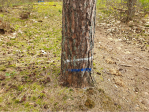 Er waren leuke weetjes o.a. over de vele kleurige markeringen op bomen. Bijvoorbeeld de combinatie van een witte met een blauwe ring, betekent dat dit bosperceel ‘met rust gelaten’ wordt. Dus geen kap of ander soortig beheer. Dit stuk bos mag oud worden op haar manier, dus woekeringen, aftakelingen, nieuwe opschot, alles mag. Met Europese subsidie wordt in het najaar van 2024, steenmeel vanuit een helikopter over de Papenvoortse Heide gestrooid. Ook weer als maatregel om verzuring tegen te gaan.