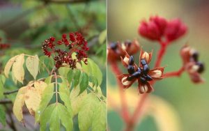 Na de bloei volgen roodachtige vruchten die hun zaden loslaten en geen vogel die er naar taalt. Onbekend maakt onbemind.