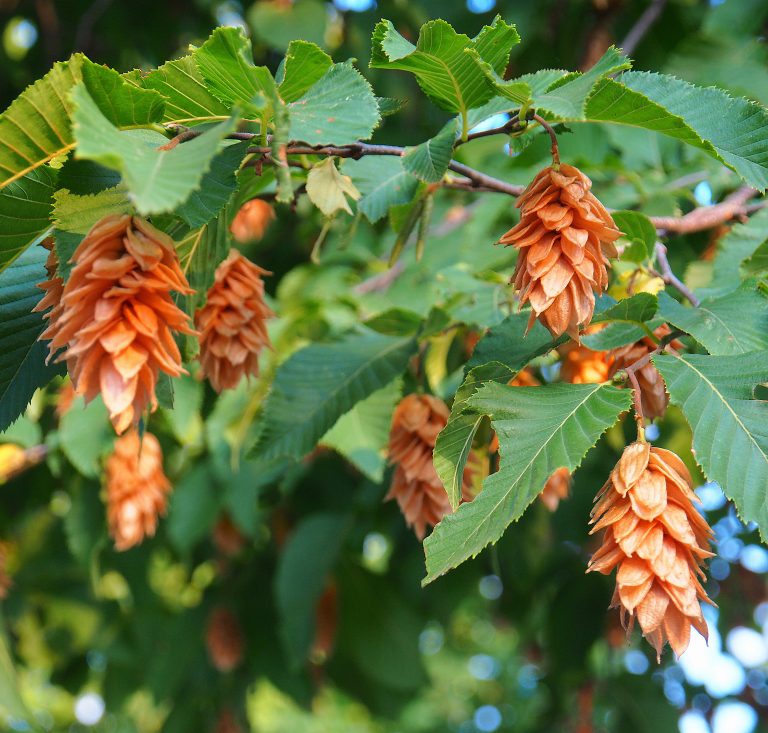 De Hopbeuk is een uitbundige bloeier met geelgroene, mannelijke katjes van circa 4 – 6 cm en onopvallende vrouwelijke bloemen in kleine aartjes. Deze groeien uit tot hopachtige bellen die tot 6cm lang zijn en prachtig roodbruin verkleuren bij rijpheid.