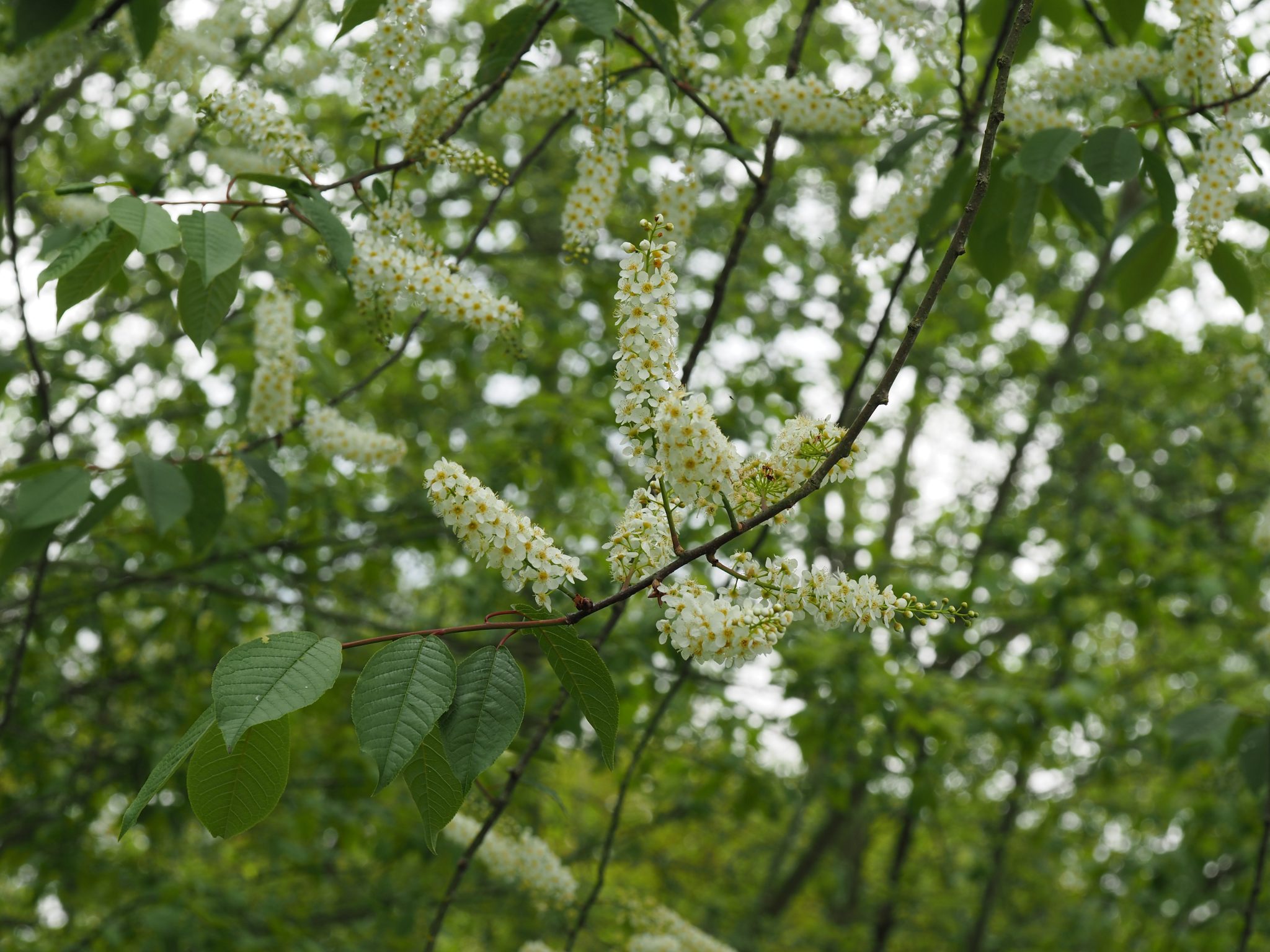 De boom bloeit in april en mei met sterk geurende witte bloemen in overhangende trossen tot wel 20cm lang. Er vliegen veel bijen op.