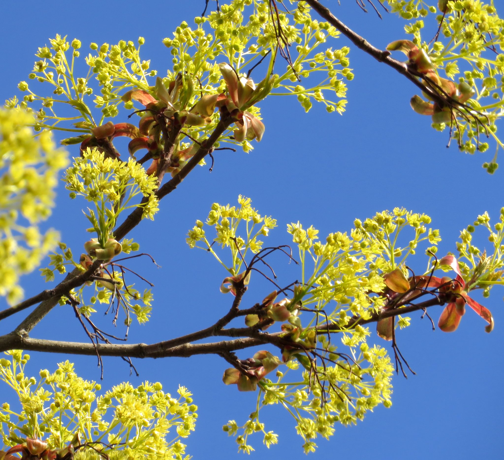 De groengele bloemen verschijnen vóór de bladontwikkeling.