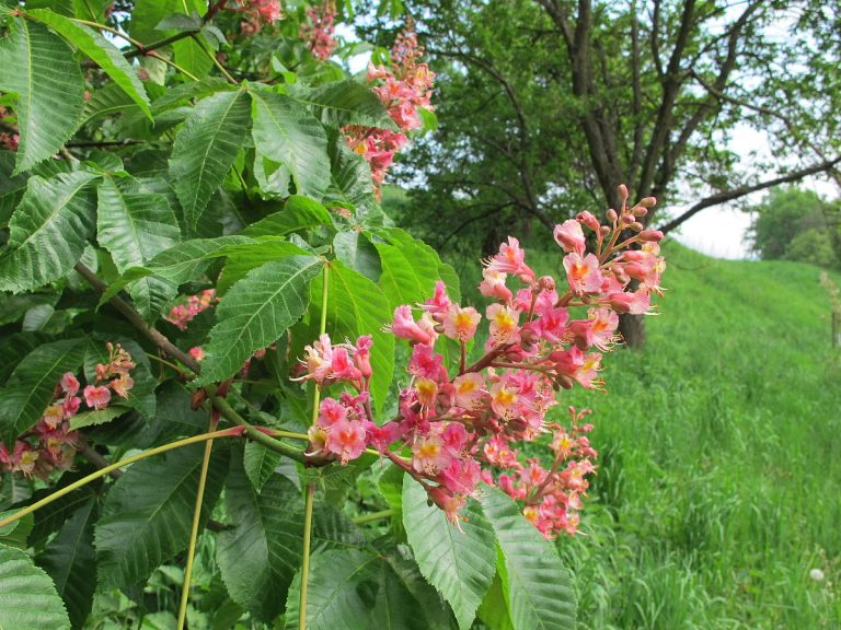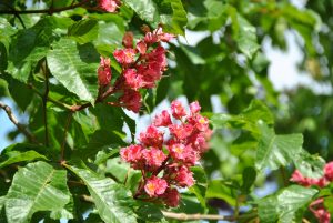 Aesculus × carnea ‘Briotii’ is een kruising tussen de Witte paardenkastanje en de Rode pavia.