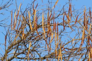 De peulvruchten die volgen blijven in de winter aan de boom hangen.