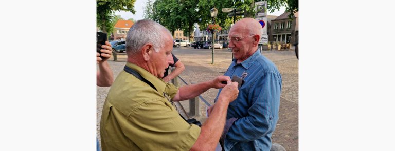 Voorafgaand aan de gierzwaluwexcursie op maandagavond 19 juni, hebben Rinus en Henk elkaar de huldespeld uitgereikt.