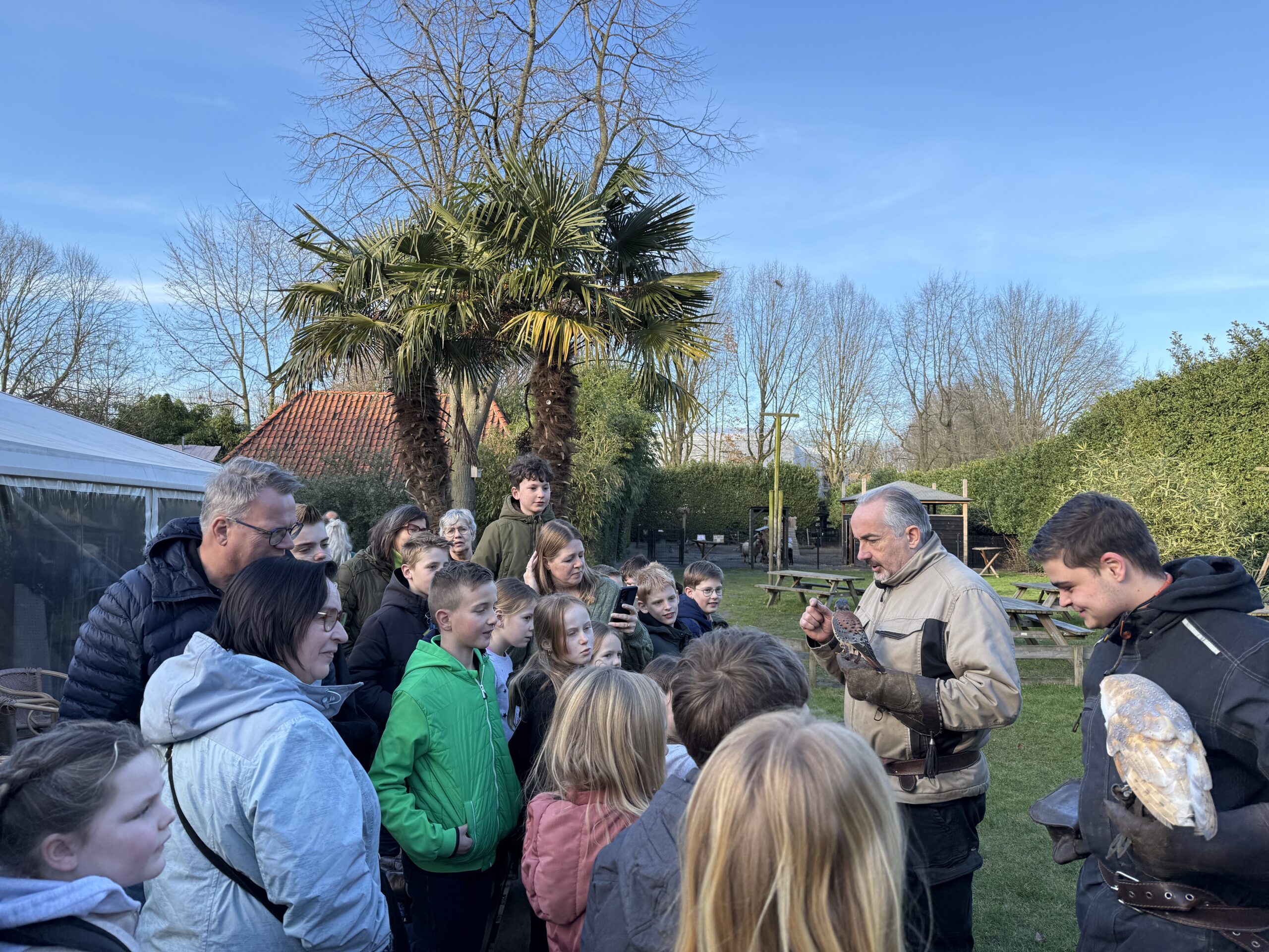 Meteen bij aankomst, door naar de roofvogelshow op het buitenterrein. Spectaculair, met rondvliegende uilen, zeearend en valken. Jammer genoeg mochten de vogels deze keer niet over onze hoofden vliegen, omdat er vogelgriep in onze regio heerst. De vogels bleven nu boven het veldje, samen met de verzorgers en een paar vrijwilligers uit het publiek. Het was toch de moeite waard!