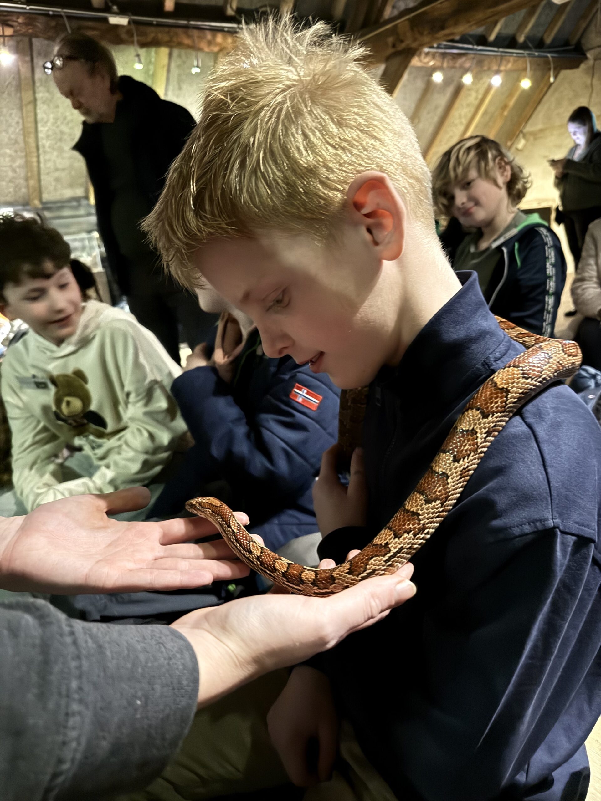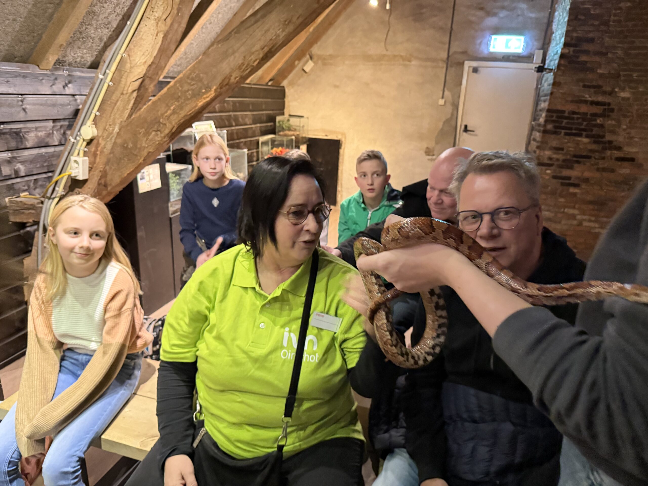 De juf vertelde ook een verhaal over de rattenslang, hoe en waar die leeft, wat hij eet en op hoe hij op roverspad gaat. Als klap op de vuurpijl mochten de helden onder ons eventjes de slang om hun nek laten krullen.