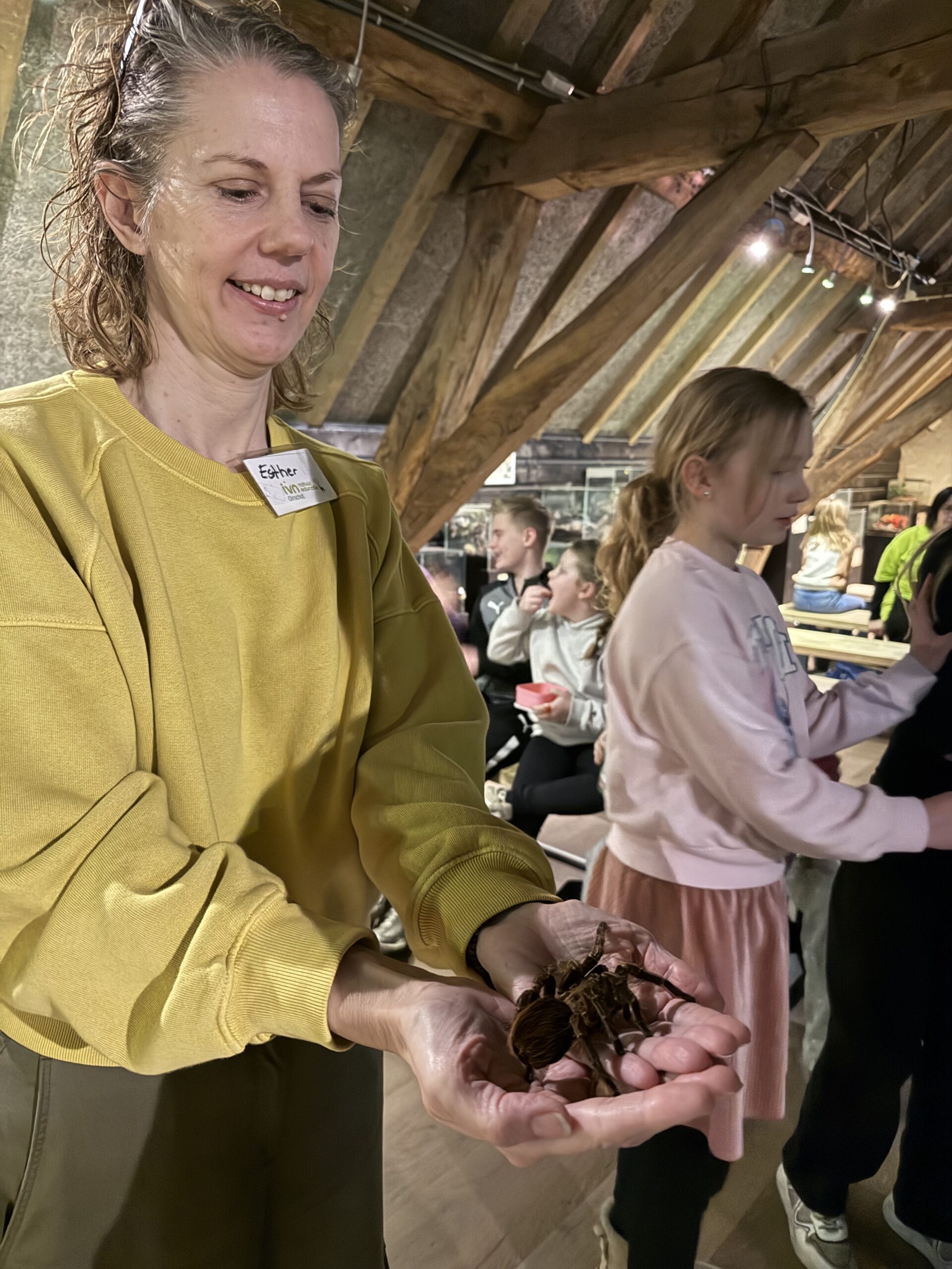 Boven op de vliering hebben we met de groep een spinnenshow bezocht. Een vogelspin met de toepasselijke naam “Kriebeltje” mochten de kinderen voorzichtig op de hand laten lopen, niet laten vallen, want als de spin een wondje krijgt, bloedt hij dood. Dat komt omdat een spin geen bloedplaatjes heeft.