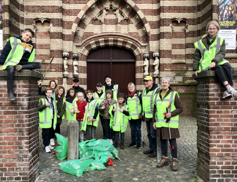 Dan gaan we in drie kleine groepjes uiteen, uitgerust met hesjes, handschoenen, afvalzakken en grijpers. Deze materialen werden door de gemeente beschikbaar gesteld.