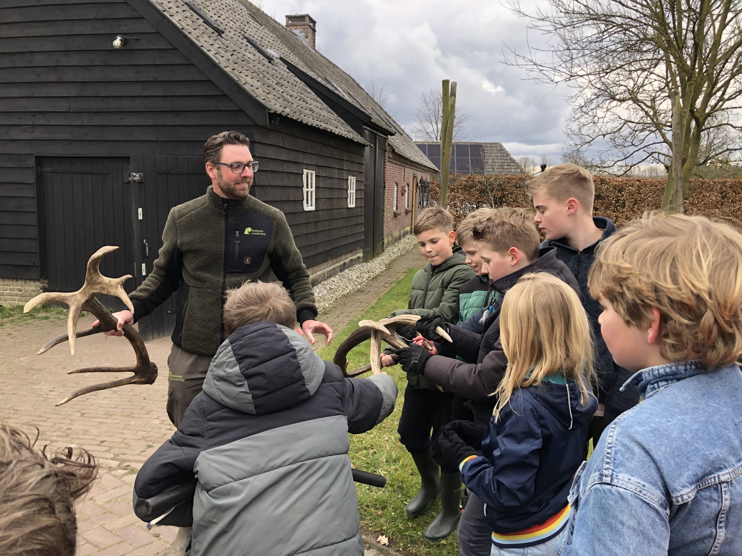 Met onze IVN-jeugdleden fietsten we naar de Lopensestraat, waar Mark Benders van het Brabants Landschap ons welkom heette. Allereerst liet hij ons trots een pas afgeworpen groot gewei zien van een edelhert. Dat maakte veel indruk op de kinderen. Zeker toen ze het zware gewei ook even mochten vasthouden.