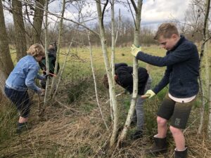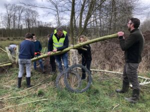 Daarna nam hij ons mee naar een weiland in de buurt, waar hij uitleg gaf over wat we mochten gaan doen. Met zagen moesten we een houtwal om gaan leggen en de afgezaagde bomen en takken moesten tussen weipalen gelegd worden. Hierin kunnen allerlei dieren wonen, schuilen en voedsel vinden.