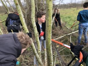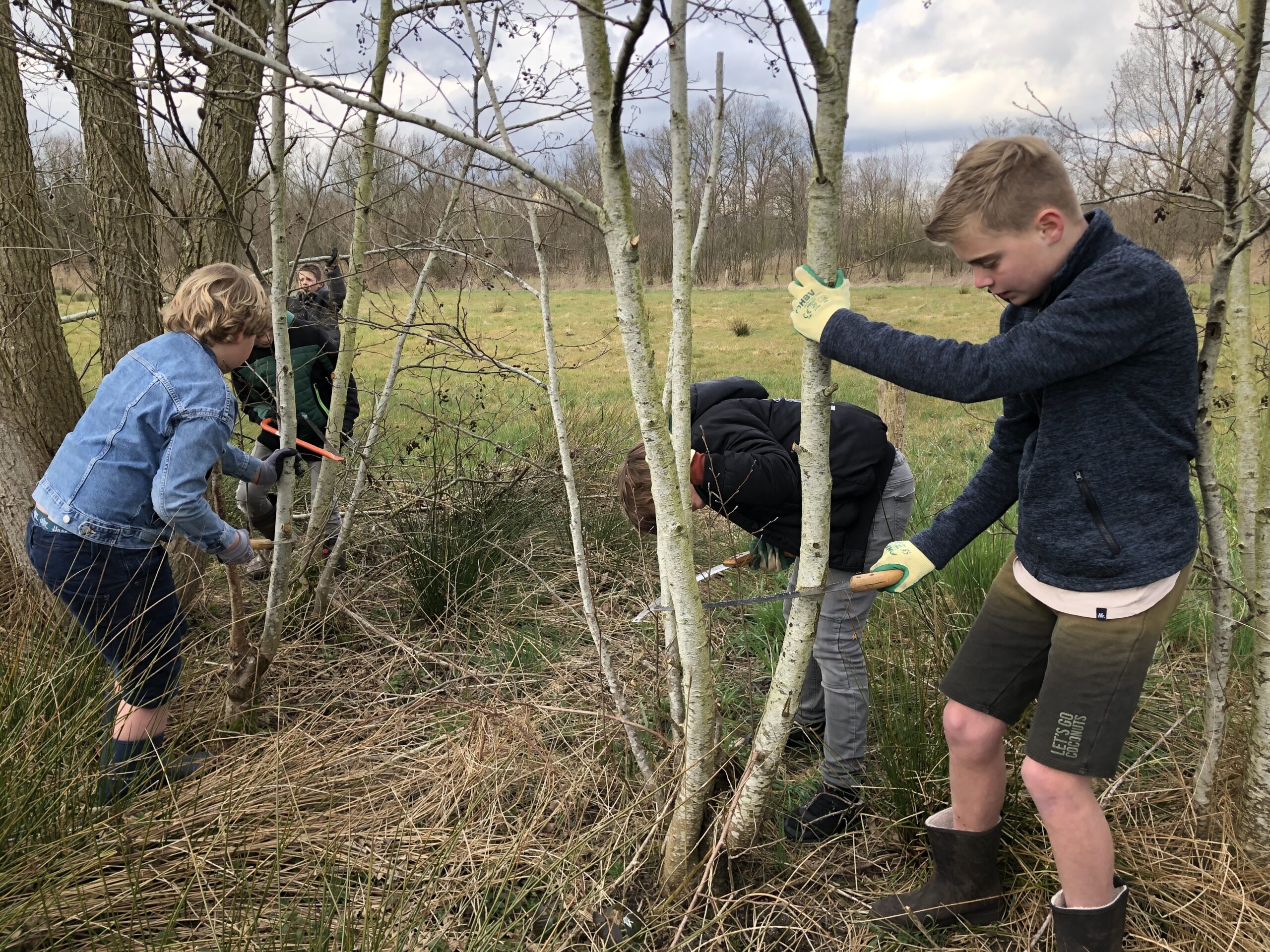 Sommige kinderen kozen eerst wat dunnere takken, maar een aantal vonden dikkere stammen een grotere uitdaging. Met man en macht werd er gezaagd en afgekort en klonk het regelmatig: “Van onderen!” en dan viel er weer een boom de wei in.