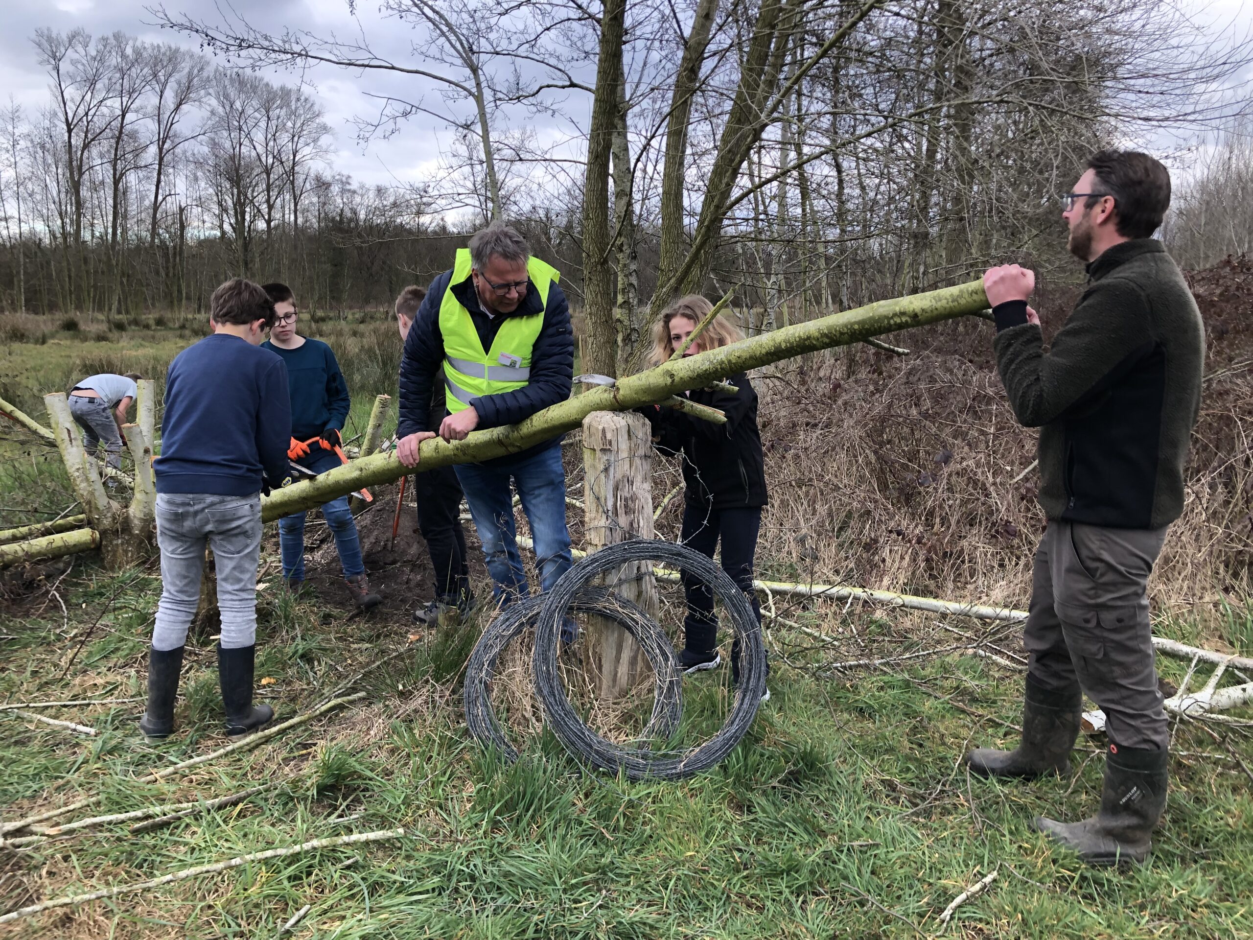 Veel te snel was het tijd voor chocomel. Nog een aantal afgezaagde takken en bomen moesten toen nog tussen de weipalen gelegd worden.