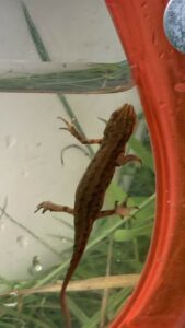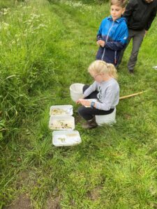 We liepen nog een eind verder, moeilijk was het ploeteren door de modder. Een enkeling ging op blote voeten, dus werd het een soort blotevoetenpad. Met mooie sneakers was dit pad niet te belopen. Bij de duiker bij de Heerenbeekloop aangekomen, schepten we eerst een paar emmers vol water om later in de bakken te doen. Daarna hebben we met schepnetjes van alles gevangen: bloedzuigers die een enkele waaghals op zijn arm zette en die zich met zuignapjes vastzogen op de arm. Verder waren er watersalamanders met prachtige oranje buikjes, kevers, dikkopjes, kikkers, larven van libellen en kevers. Nadat we de waterplanten uit de netjes verwijderd hadden, werden de diertjes in bakken gedaan en via de zoekkaart keken we wat het was. Een grote libellenlarve was erg vraatzuchtig, want je kon zien hoe hij een dikkopje helemaal leegzoog. Op het eind, soms met water in de laarzen, werden de diertjes weer in de Heerenbeekloop teruggezet. Alle kinderen waren erg enthousiast, ondanks dat ze bijna lek gestoken werden door de muggen.