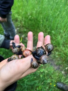 Liempdsedijk zijn we richting het startpunt van de middag gewandeld. Dit was al een avontuur op zich. We waren nog geen minuut onderweg of de meeste kinderen hadden hun handen al vol met slakken. Ook het inspuiten tegen de muggen bleek geen overbodige luxe. En de bolderkar kiepte ook nog eens om in een modderplas.