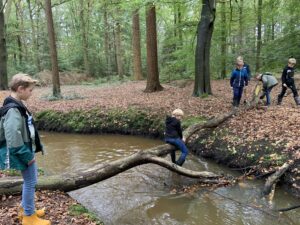 Op weg terug naar de kapel mochten de kinderen die er zin in hadden over een boomstronk naar de overkant en verderop via een andere boomstronk terug naar het pad.