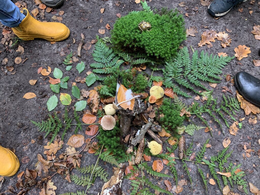 Onderweg kwamen we veel paddenstoelen tegen: de rood/witte russula, porseleinzwam en de gele knolamaniet. In de holte van een boom kwamen we ook heel veel koraalzwammen tegen. De kinderen waren erg enthousiast. Emmy had een app op haar telefoon waarmee ze de namen van de paddenstoelen op kon zoeken als de leiding het niet zeker wist. De aardappelbovist had de grootste aantrekkingskracht op de kinderen. Maar: eerst voelen of hij wel zacht genoeg is. Als hij nog te hard is en je maakt hem kapot kan hij zich niet meer voortplanten…