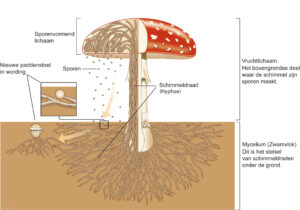 Want wat is een paddenstoel eigenlijk? Wat je boven de grond ziet is het vruchtlichaam van de zwamvlok en onder de grond liggen de draden van de schimmel (mycelium). Hij plant zicht voort door sporen die hij laat vallen. Hier had Leo een mooi voorbeeld van meegenomen: als je thuis een champignon op een wit blaadje legt dan zie je de volgende dag precies aan de rechte lijnen dat de champignon plaatjes heeft aan de onderkant van zijn hoed. Bij een buisjeszwam krijg je een afdruk met puntjes.