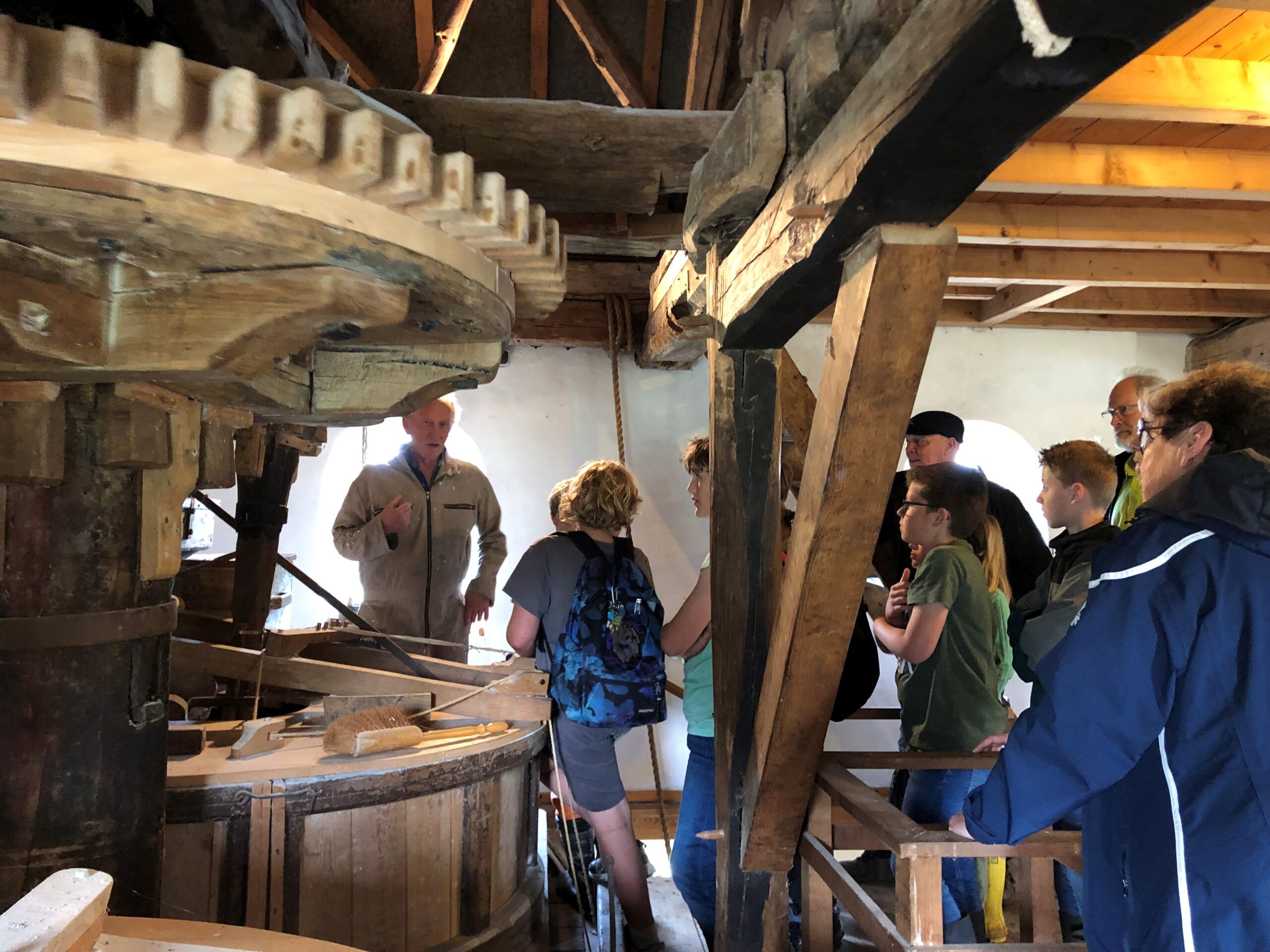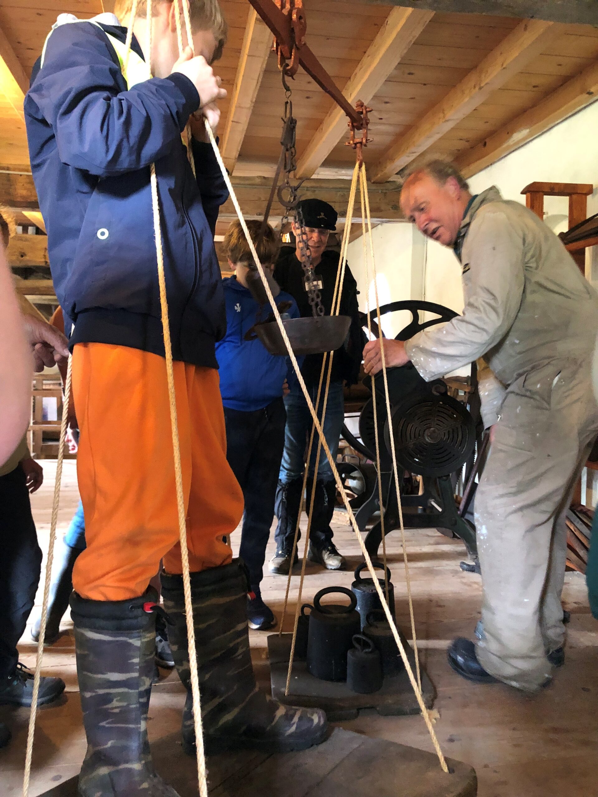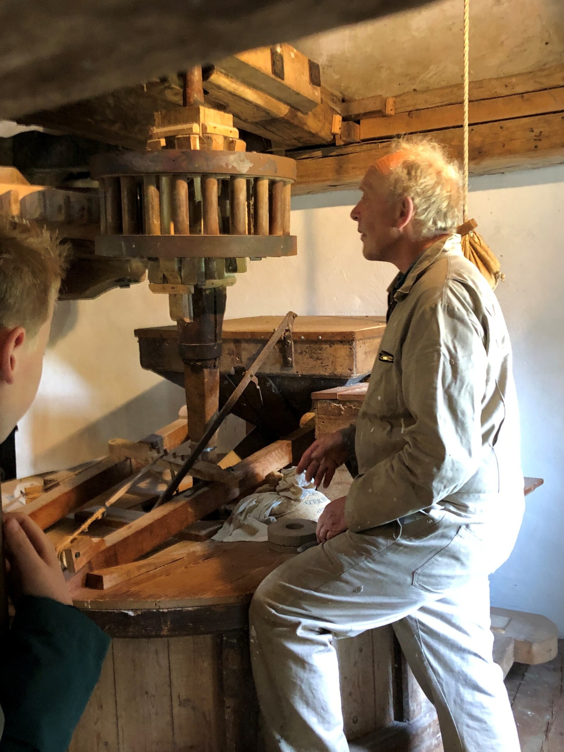 Emiel leidde ons trots rond en legde geduldig uit hoe zijn watermolen werkt en wat er allemaal nodig is om van graan meel te maken. Op alle vragen van de kinderen wist hij duidelijke antwoorden te geven!