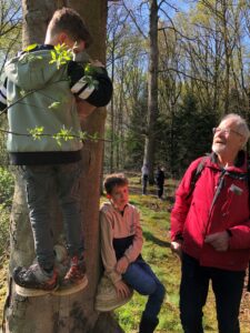 Chocomel op dan in een snellere pas op de weg terug. Want het is altijd spannend of we weer op een redelijke (lees afgesproken) tijd terug zijn. Met kinderen door de natuur struinen kost altijd meer tijd dan je denkt. Houdt die gasten maar eens op het (rechte) bospad! Op de weg terug nog wel een leuke opdracht om de onderkant van het bladerdek of de boomkruinen te verkennen. Probeer het maar eens om met een spiegel horizontaal op je neusbrug gehouden door het bos te lopen. Je ziet verrassende dingen. En je hoopt dat diegenen die jou gidst oplet zodat je niet tegen een boom loopt. Nog een stukje lopen en dan zien we dat alle fietsen er nog netjes staan. Onder het oog van een heilige moest dat natuurlijk ook wel goed komen 😉. Iedereen in het zadel en onderweg terug naar het dorp.