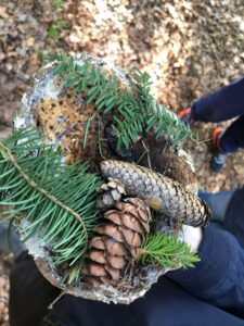 Onderweg naar Loevestein wordt door sommigen de uitdaging aangenomen om over te steken en weer terug te komen via een over de stroom liggende boomstam. Het liefst zonder nat pak. En gelukkig waren er geen handdoeken nodig. Verder onderweg werd nog wel her en der een natte voet opgelopen door te stappen in een sompige sloot of de blubber van de Beerze. Naast het gezellige dollen tijdens de wandeling werd er ook nog gewerkt aan serieuze opdrachten. Ga maar eens zoeken naar drie verschillende soorten vruchten en bijbehorende takjes van dennenbomen. Na enig speurwerk werden zowel van de Fijnspar, Douglasspar (die met de snorretjes aan de dekschubben volgens Leo) als de Hemlockspar de gevraagde onderdelen gevonden. Naast het verkennen van de dierensporen tegen de wallenkant van de beek werd er stilgestaan bij het meanderen van de rivier en de waarneembare effecten. Sneller en langzamer stromend water afhankelijk van de buiten- of binnenbocht in de beek en het afkalven of verzanden van de wallekant werd genoemd en herkend door de jeugd. Bij de vreemde bandvormige afdrukken om de stammen van beuken in een gedeelte waar het onderhout in zijn geheel weg gehaald is wordt toegelicht dat ook bomen last kunnen hebben van zonnebrand. Factor 30+ smeren is dan geen oplossing, maar omwikkelen van de stam met jute dat blijkt de oplossing. Weer wat geleerd.